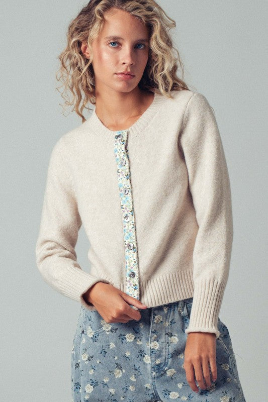 Elevate your wardrobe with this Floral Contrast Crew Neck Cardigan, designed to blend classic comfort with modern flair. Its delicate floral detailing contrasts beautifully against the solid base, adding a graceful touch to any outfit. Perfect for layering, this cardigan offers softness and warmth without compromising style, making it an essential piece for transitioning seasons. Whether dressed up or down, its versatile design ensures you feel confident and chic all day long.